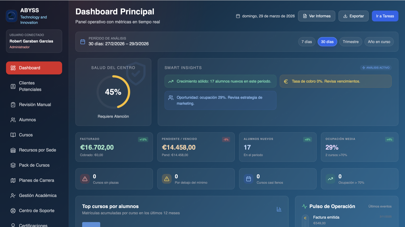 ABYSS plantea una capa operativa para escuelas y centros marítimos que necesitan trazabilidad STCW, control documental, planificación y reporting sin depender de hojas de cálculo dispersas.