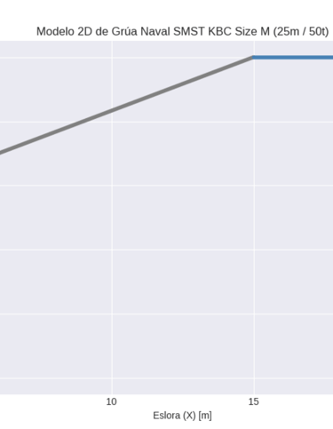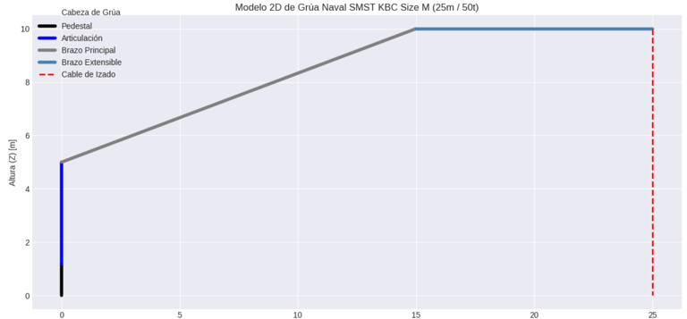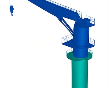 The implemented model represents an offshore crane mounted on a pedestal, structurally defined using 3D beam elements. A realistic load is applied (for example, 50 metric tons at the boom tip), and the analysis includes: