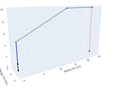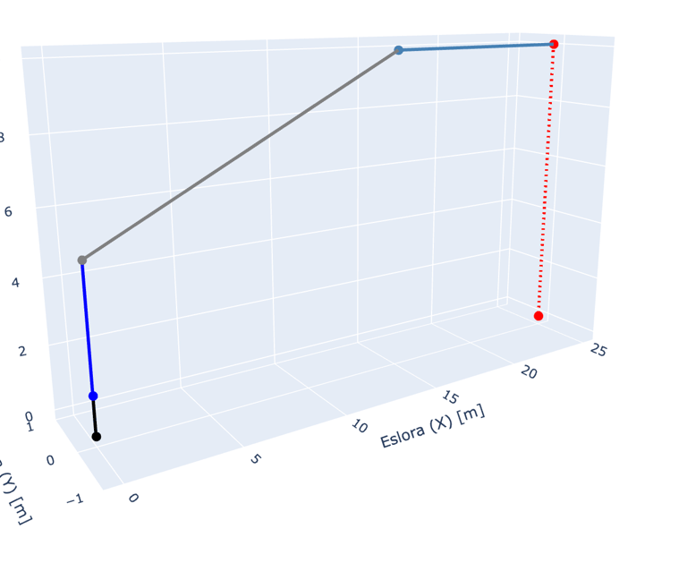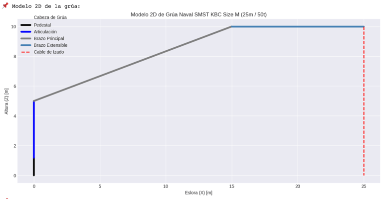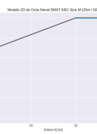 El modelo implementa una grúa offshore instalada sobre pedestal, estructurada con elementos de tipo viga 3D. Se aplica una carga real (por ejemplo, 50 toneladas en punta de brazo) y se analizan: