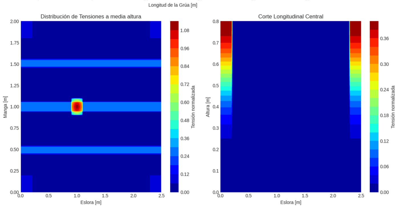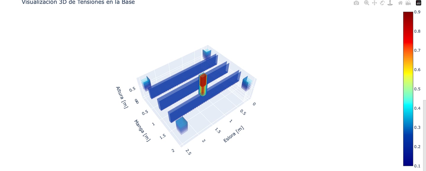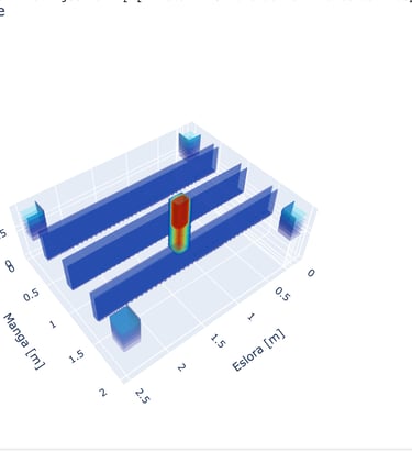Essa análise contempla condições operacionais típicas de estruturas offshore e está em conformidade com normas internacionais, como a DNVGL-ST-0378 e a ABS. Os resultados são apresentados por meio de gráficos 3D de deformação, mapas de tensões e curvas de resposta estrutural, facilitando a interpretação técnica.