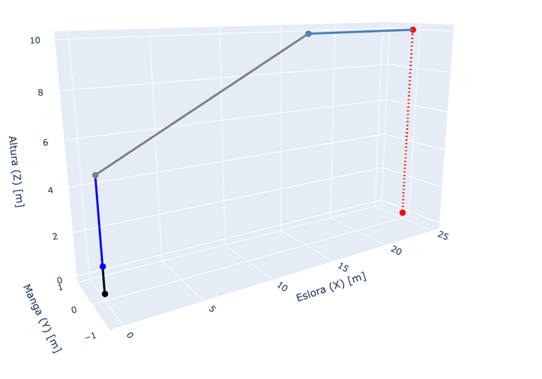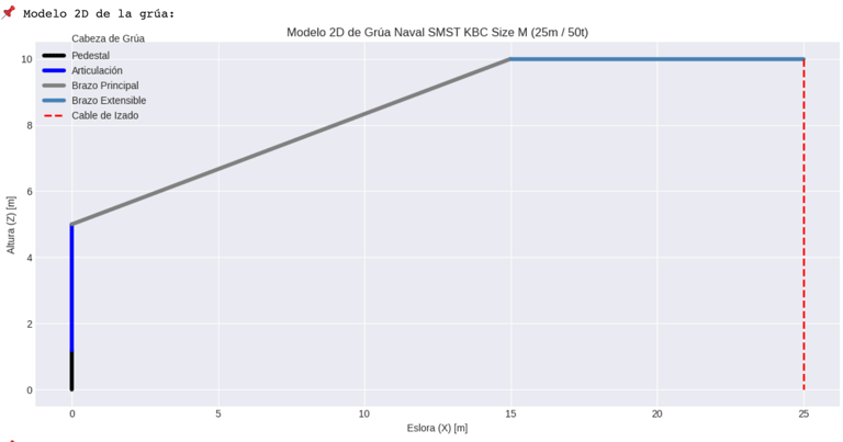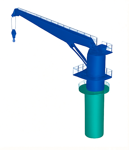O modelo implementa um guindaste offshore montado sobre pedestal, estruturado com elementos de viga 3D. É aplicada uma carga real (por exemplo, 50 toneladas na extremidade do braço) e são analisados os seguintes comportamentos estruturais: